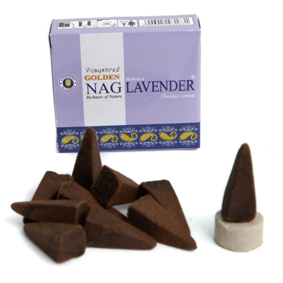 Golden Nag Lavender wierook kegels van Vijayshree Fragrance uit Bangalore, India. Deze wierook is een van meest populaire wierook van de wereld met zijn betoverende en boeiende aroma. De beste specerijen, kruiden, bloemenextracten, exotische oliën en andere natuurlijke ingrediënten zijn zorgvuldig geselecteerd en vakkundig gemengd.