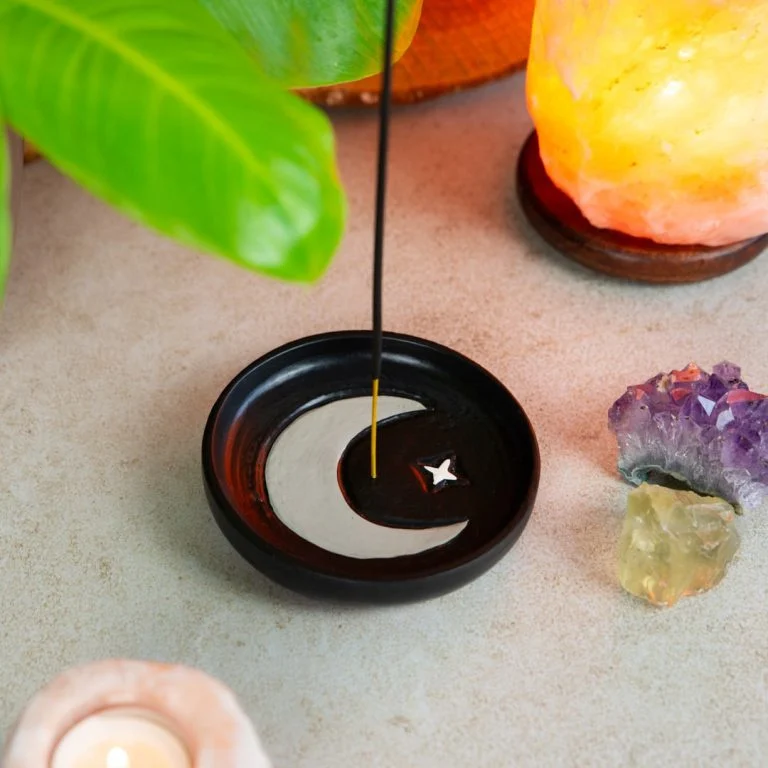 Prachtig wierookplankje zwart met Maan, is afkomstig uit Indonesië- handgemaakt en handgeschilderd houten plankje.