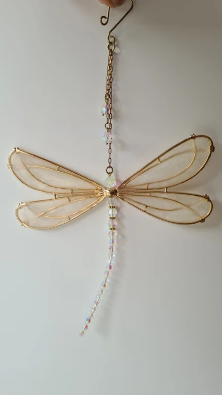 Een unieke zonnevanger met kleine regenboogkristallen in het lijfje van de libelle, de libelle vleugels bestaan zelf uit epoxy – 26cm lang x 15cm breed.