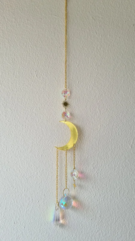 Een unieke raamhanger met regenboogkristal, zon, maan en ster- 37cm lang.
