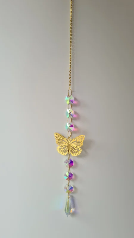 Een unieke zonnevanger met regenboogkristallen en vlinder – 36cm lang.