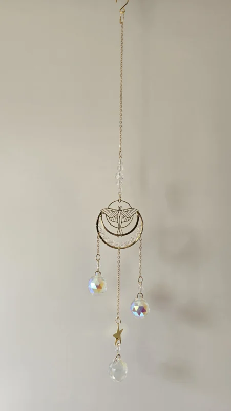 Een unieke zonnevanger met meerdere regenboogkristallen, grote maan, maanvlinder, ster en kristal bolletjes – 41cm lang.
