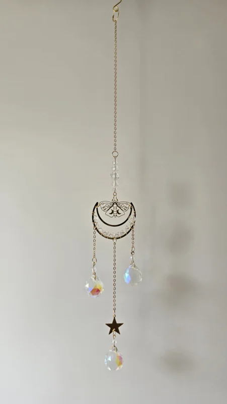 Een unieke zonnevanger met meerdere regenboogkristallen, grote maan, nachtvlinder, ster en kristal bolletjes – 41cm lang.